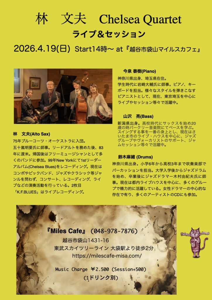 ライブ告知 2026/4/19(日)14:00~ 林 文夫 Chelsea Quartet ライブ&セッション